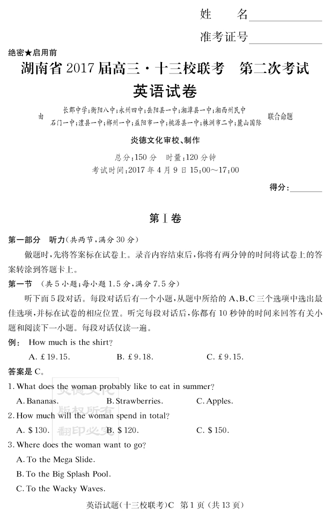 【英語】炎德英才大聯(lián)考2017長郡中學(xué)高三8次月考(十三校聯(lián)考二)