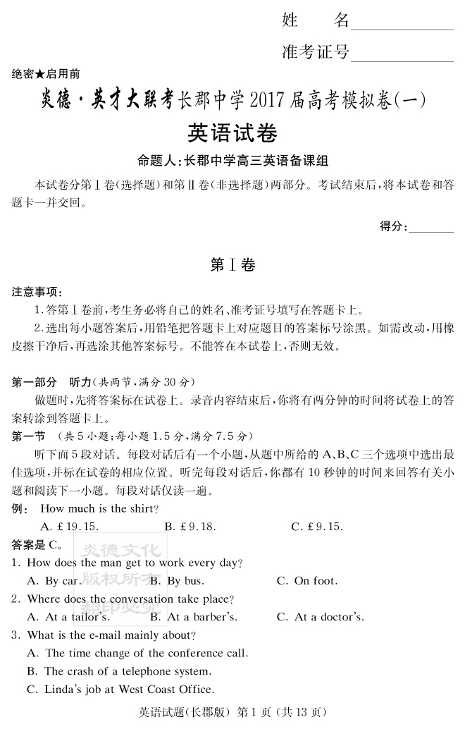 【英語(yǔ)】炎德英才大聯(lián)考2017長(zhǎng)郡中學(xué)高三9次月考(模擬一)