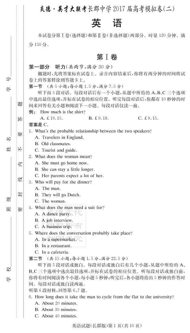 【英語(yǔ)】炎德英才大聯(lián)考2017長(zhǎng)郡中學(xué)高三10次月考(模擬二)