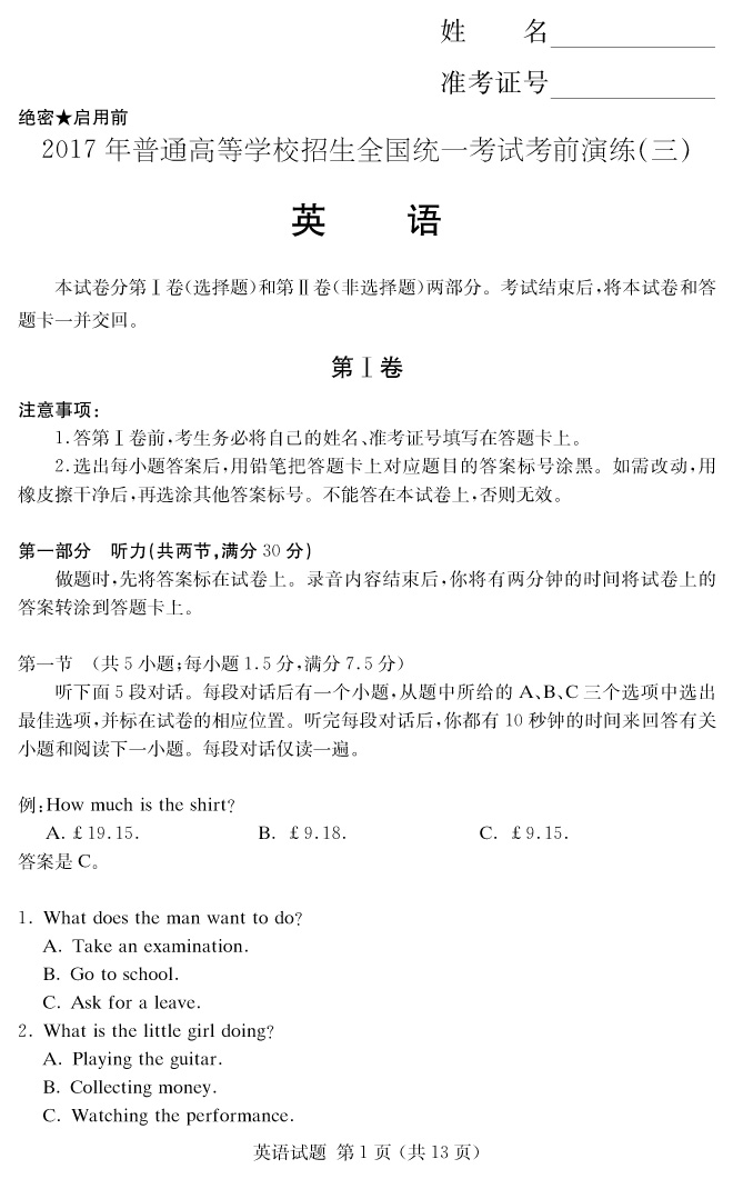 下一篇:【語文】2017年普通高等學校招生全國統(tǒng)一考試考前演練(三)