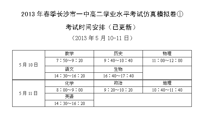 下一篇:2013年春季長(zhǎng)沙市一中高二學(xué)業(yè)水平考試仿真模擬卷②考試時(shí)間安排(2013.05.31-06.02)