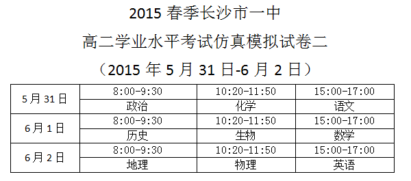 2015春季長沙市一中高二學(xué)業(yè)水平考試仿真模擬試卷二考試時間安排(2015年5月31日-6月2日)