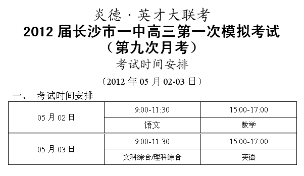炎德英才大聯(lián)考長(zhǎng)沙市一中2012屆高三第一次模擬(第九次月考)考試時(shí)間和范圍