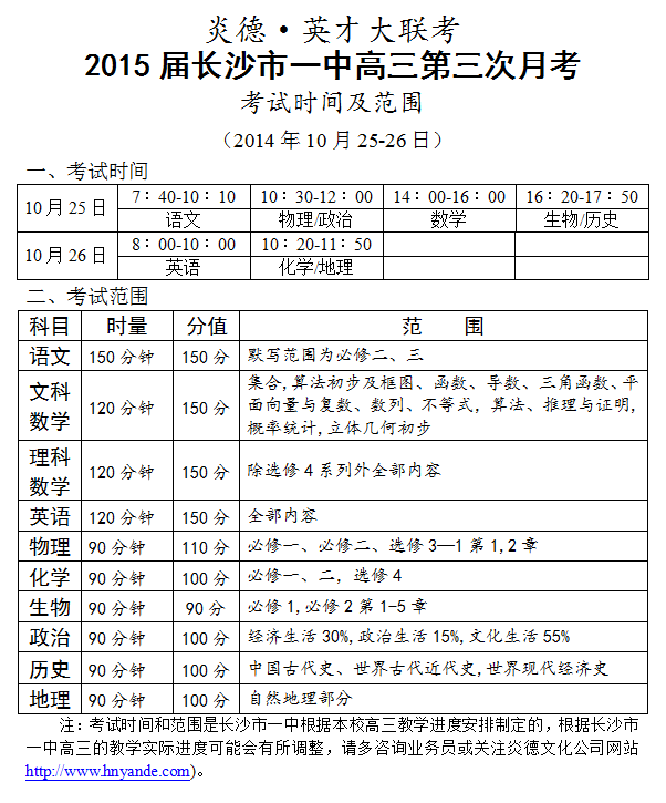 炎德英才大聯(lián)考長沙市一中2015屆高三第3次月考考試時(shí)間和范圍(2014.10.25-26)