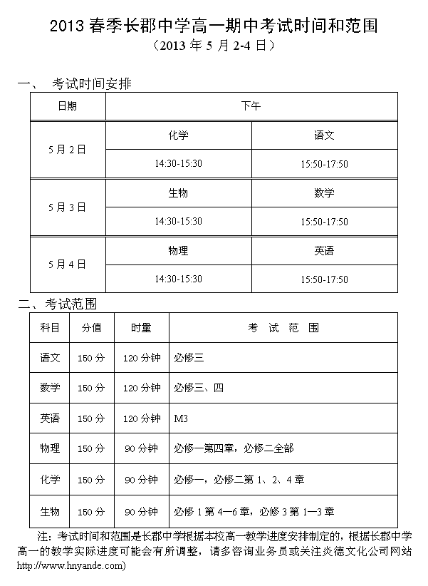 2013春季長(zhǎng)郡中學(xué)高一期中考試時(shí)間和范圍(2013年5月2-4日)