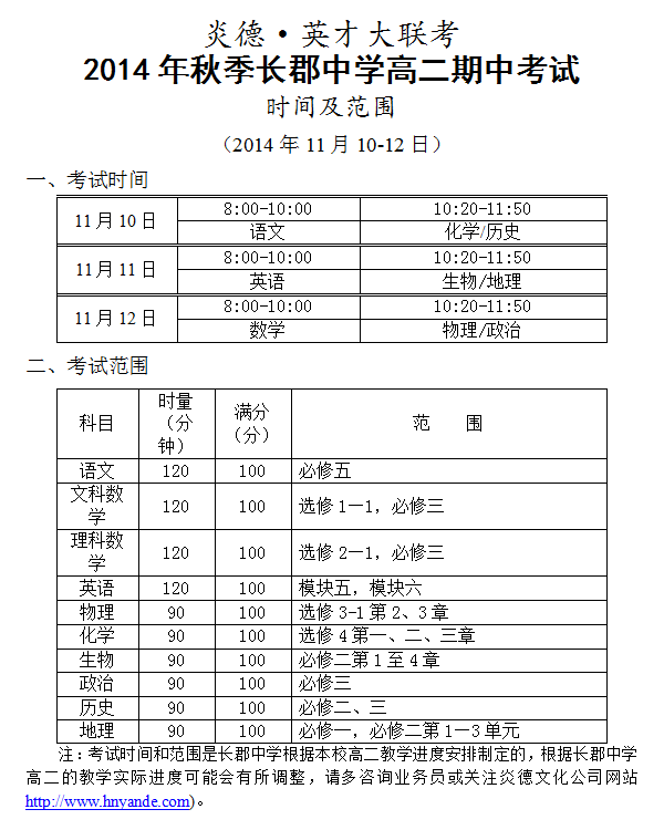 炎德英才大聯(lián)考2014年秋季長郡中學(xué)高二期中考試時(shí)間和范圍(2014.11.10-12)