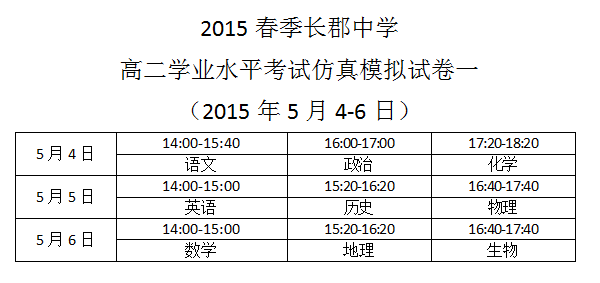2015春季長郡中學(xué)高二學(xué)業(yè)水平考試仿真模擬試卷一考試時間安排(2015年5月4-6日)
