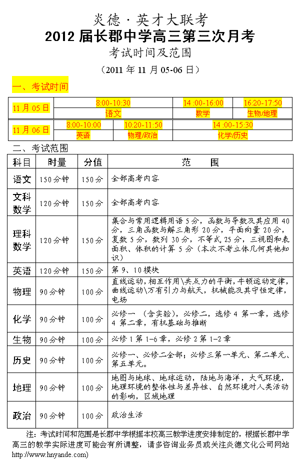 炎德英才大聯(lián)考長(zhǎng)郡中學(xué)2012屆高三第三次月考考試時(shí)間和范圍