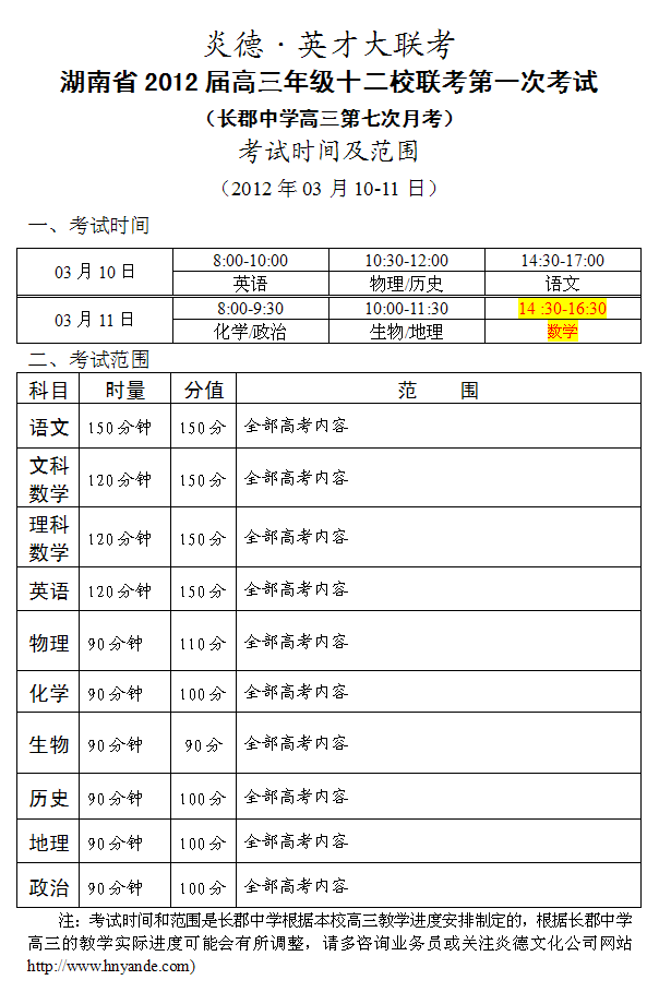 炎德英才大聯(lián)考長郡中學(xué)2012屆高三第七次月考(湖南省2012屆十二校聯(lián)考一)考試時(shí)間和范