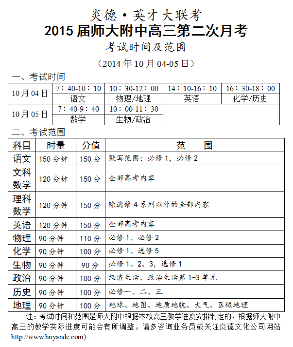 下一篇:炎德英才大聯(lián)考師大附中2015屆高三第3次月考考試時間和范圍(2014.10.31-11.01)