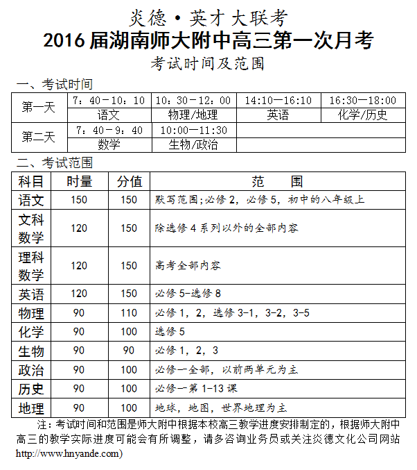 炎德英才大聯(lián)考湖南師大附中2016屆高三第1次月考考試時(shí)間和范圍