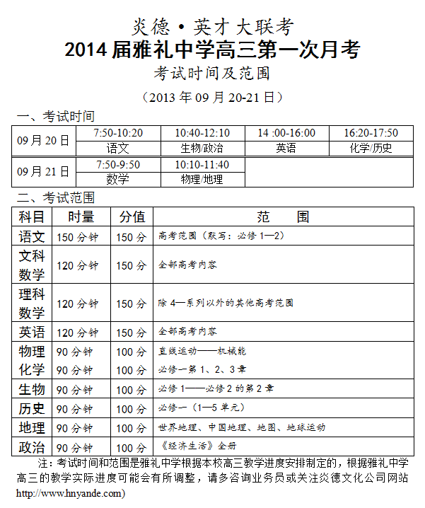 炎德英才大聯(lián)考雅禮中學(xué)2014屆高三第1次月考考試時(shí)間和范圍(2013.09.20-21)