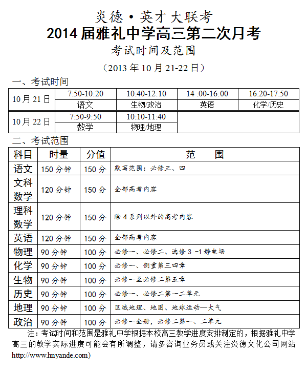 下一篇:炎德英才大聯考雅禮中學2014屆高三第3次月考考試時間和范圍(2013.11.18-19)