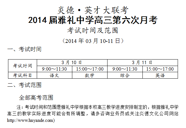 炎德英才大聯(lián)考雅禮中學(xué)2014屆高三第7次月考考試時(shí)間和范圍(2014.03.10-11)