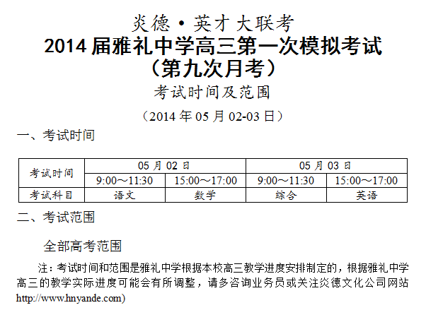 炎德英才大聯(lián)考雅禮中學(xué)2014屆高三第一次模擬(第9次月考)考試時(shí)間和范圍(2014.05.0