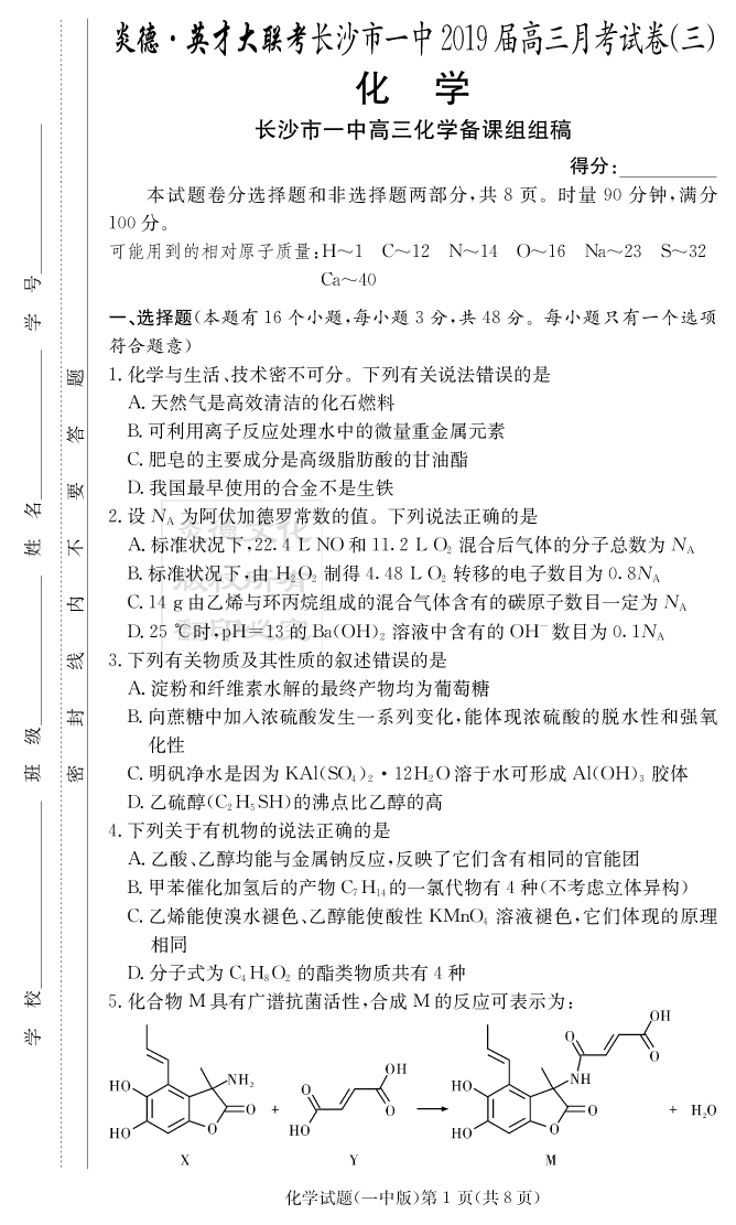 【化學(xué)】炎德英才大聯(lián)考2019長(zhǎng)沙一中高三3次月考