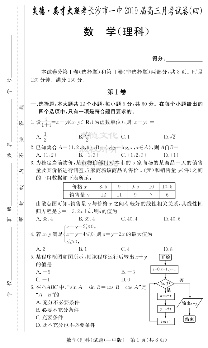 【理數(shù)】炎德英才大聯(lián)考2019長(zhǎng)沙一中高三4次月考