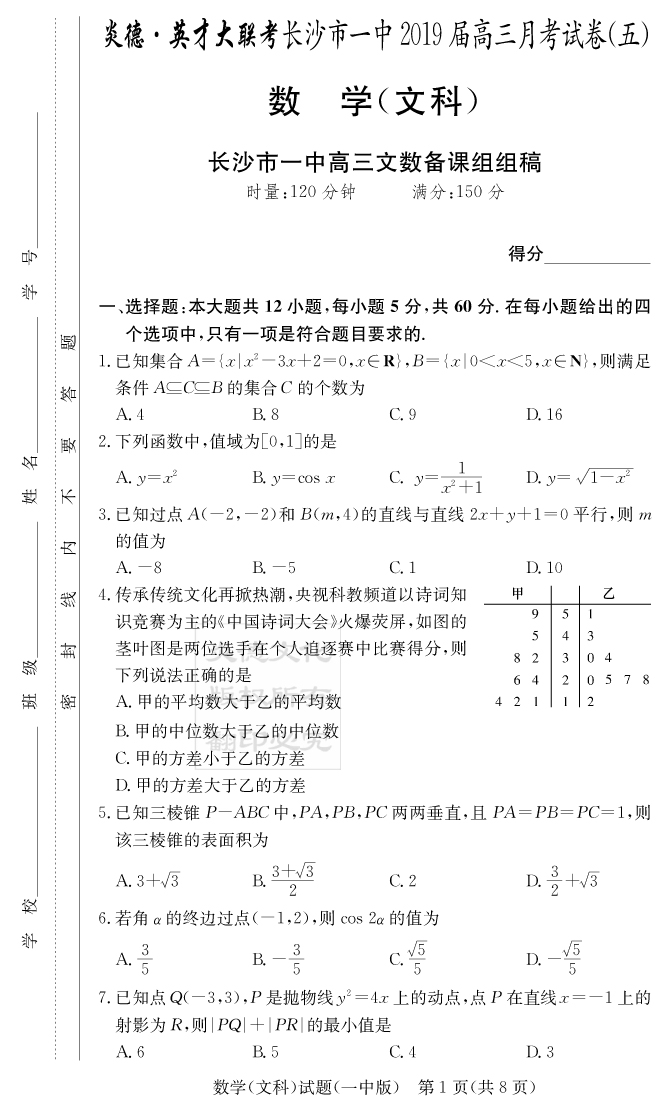 【文數(shù)】炎德英才大聯(lián)考2019長(zhǎng)沙一中高三5次月考
