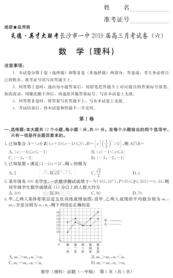 【理數(shù)】炎德英才大聯(lián)考2019長沙一中高三6次月考