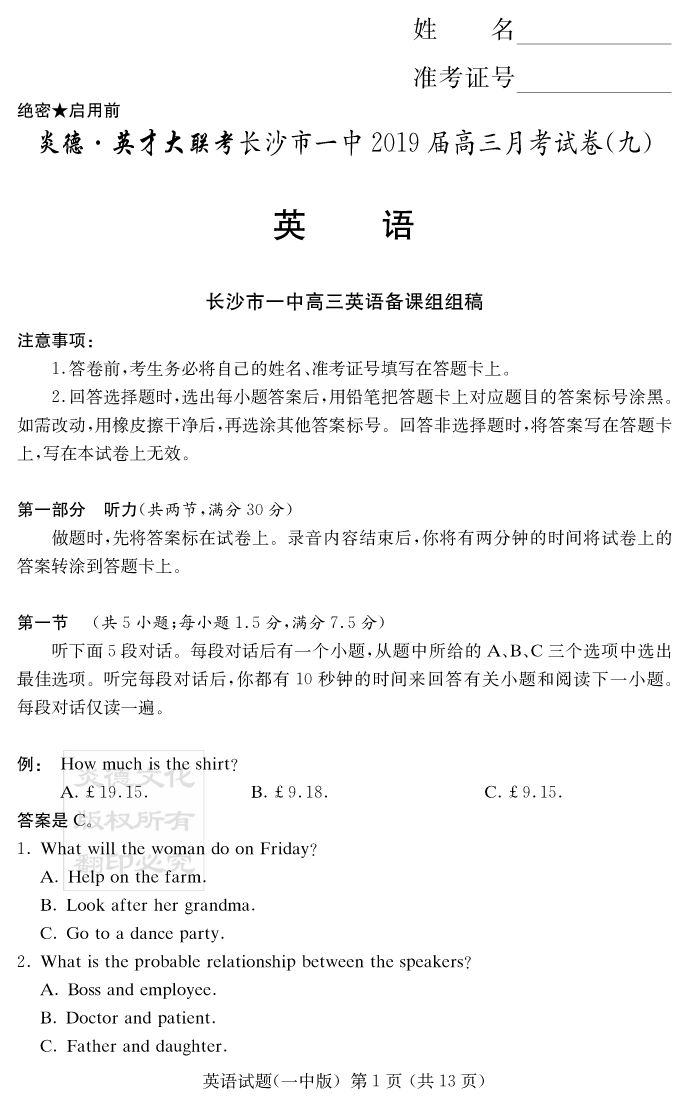 【英語】炎德英才大聯(lián)考2019長沙一中高三9次月考