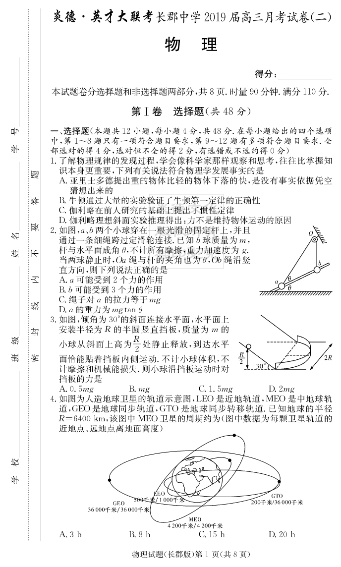 【物理】炎德英才大聯(lián)考2019長郡中學(xué)高三2次月考