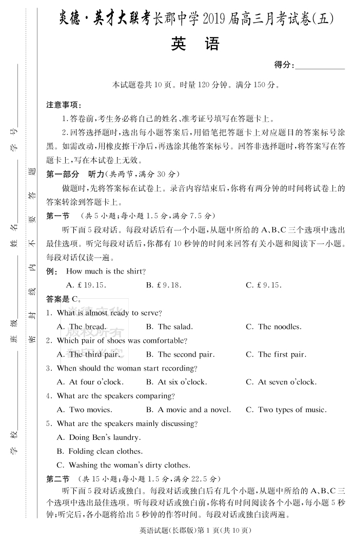 【英語】炎德英才大聯(lián)考2019長郡中學高三5次月考