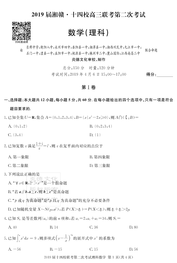 【理數(shù)】炎德英才大聯(lián)考2019長郡中學(xué)高三8次月考(十四校聯(lián)考二)