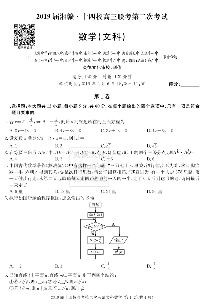 【文數(shù)】炎德英才大聯(lián)考2019長郡中學(xué)高三8次月考(十四校聯(lián)考二)