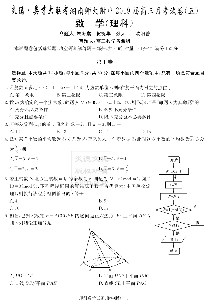 【理數(shù)】炎德英才大聯(lián)考2019師大附中高三5次月考