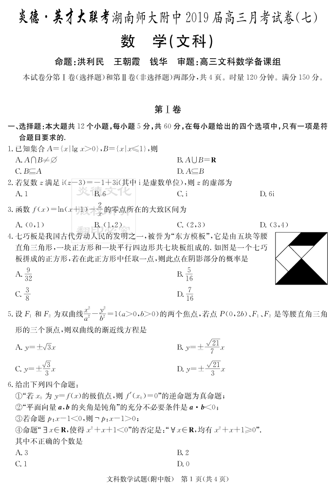 【文數(shù)】炎德英才大聯(lián)考2019師大附中高三7次月考