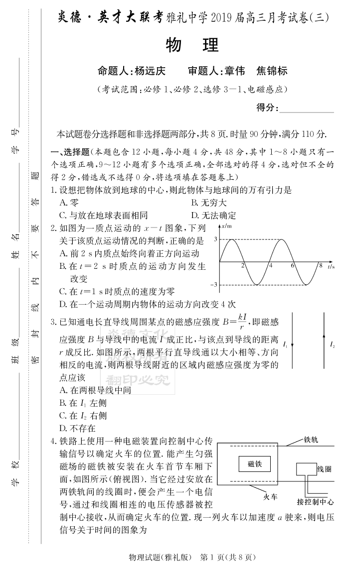 【物理】炎德英才大聯(lián)考2019雅禮中學(xué)高三3次月考