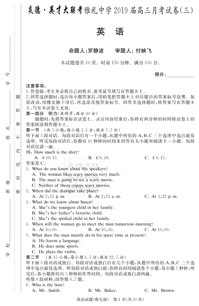 【英語】炎德英才大聯(lián)考2019雅禮中學(xué)高三3次月考