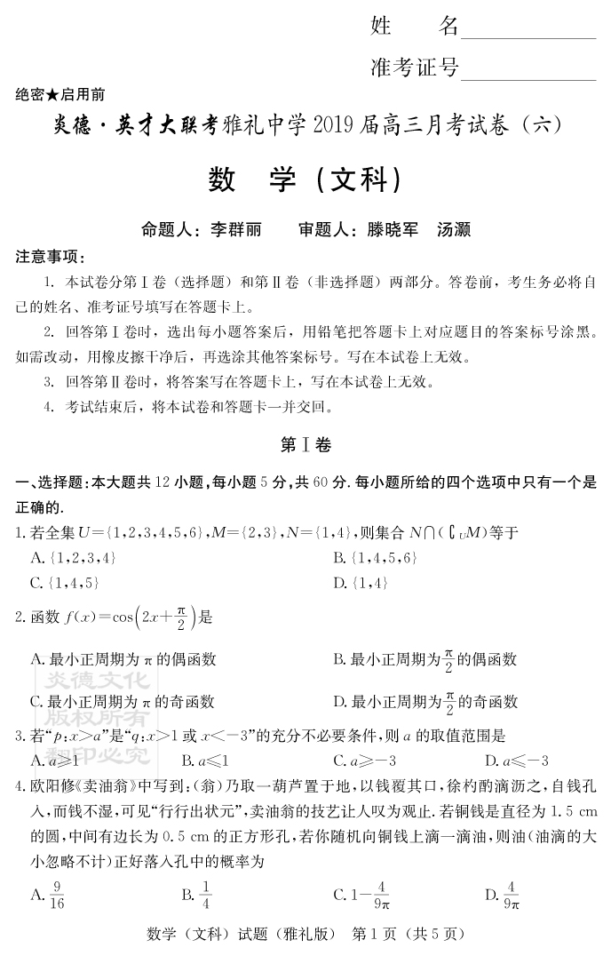 【文數(shù)】炎德英才大聯(lián)考2019雅禮中學(xué)高三6次月考