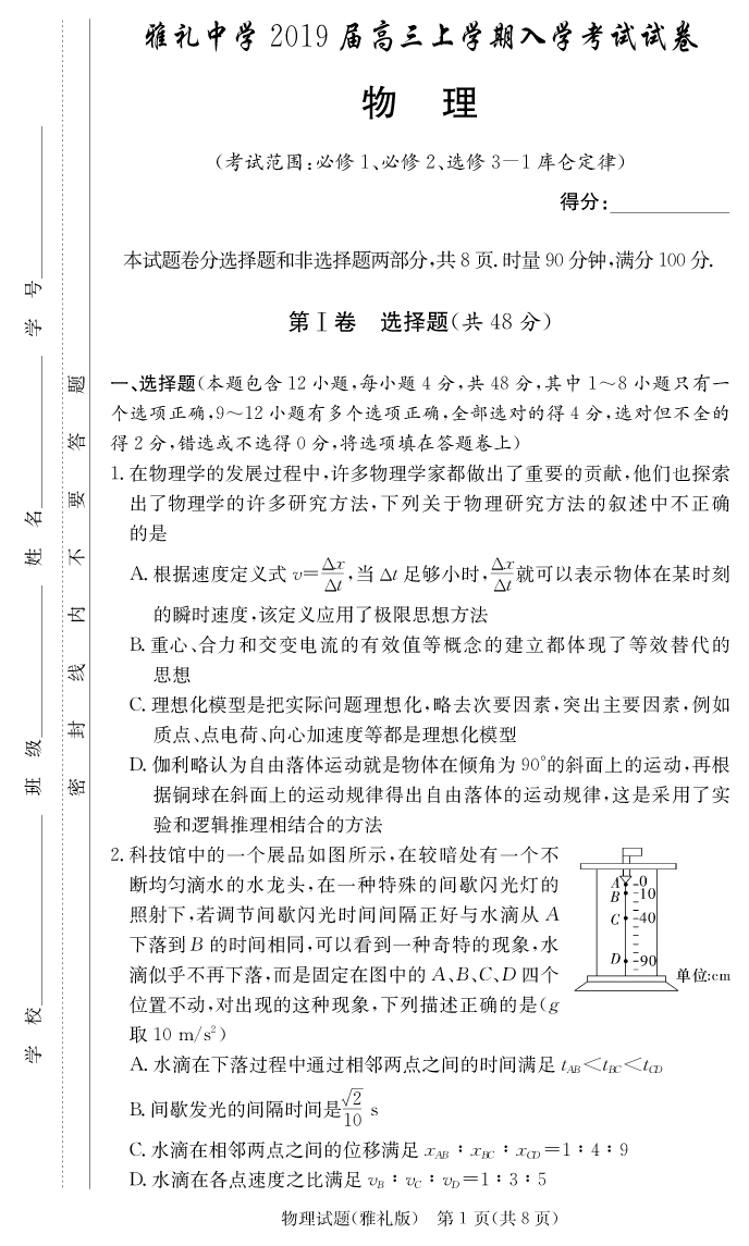 【物理】雅禮中學(xué)2019屆高三上學(xué)期入學(xué)考試