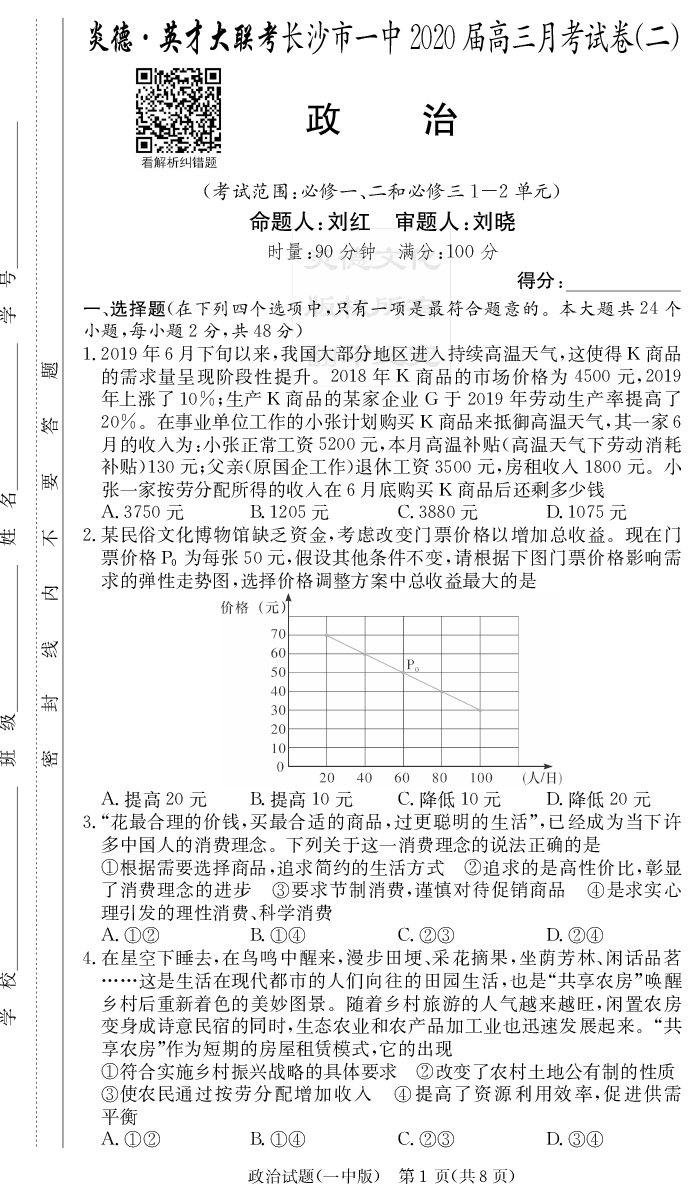 【政治】炎德英才大聯(lián)考2020屆長(zhǎng)沙市一中高三2次月考
