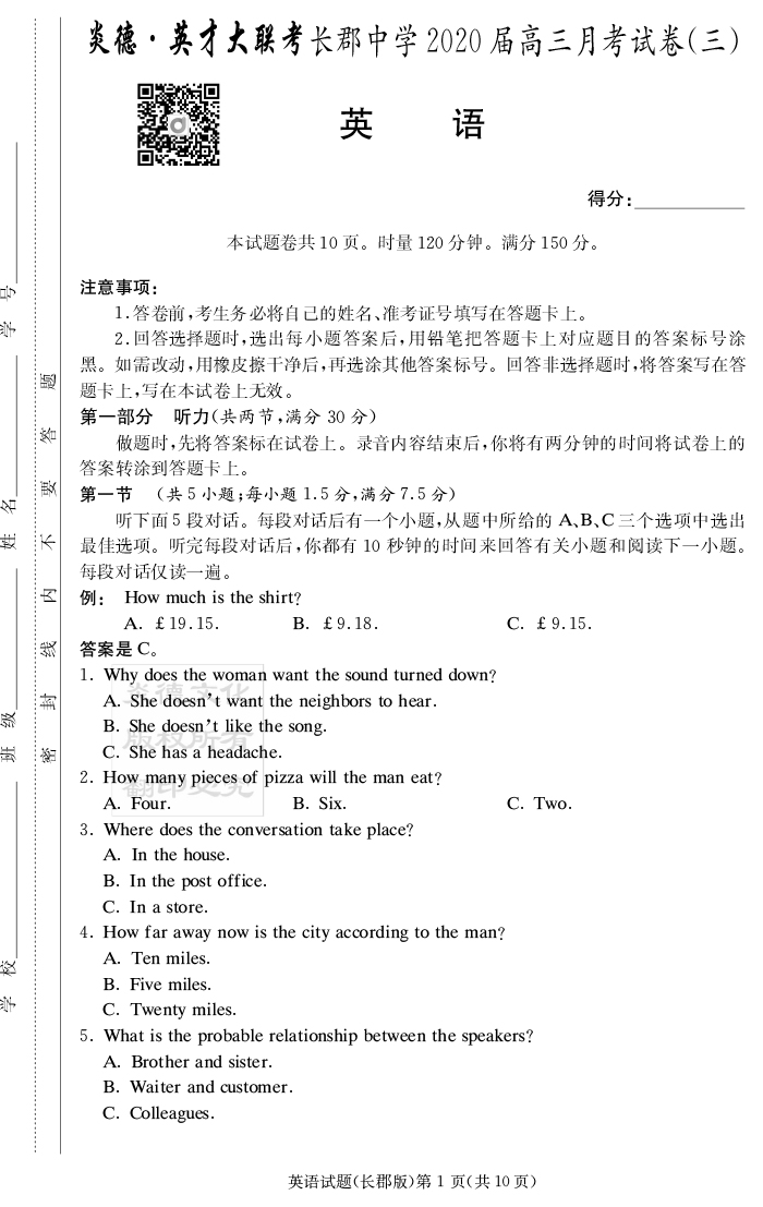 【英語(yǔ)】炎德英才大聯(lián)考2020屆長(zhǎng)郡中學(xué)高三3次月考