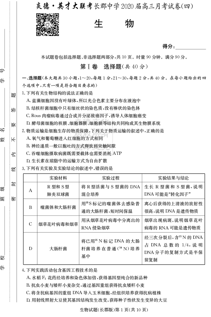 【生物】炎德英才大聯(lián)考2020屆長郡中學(xué)高三4次月考