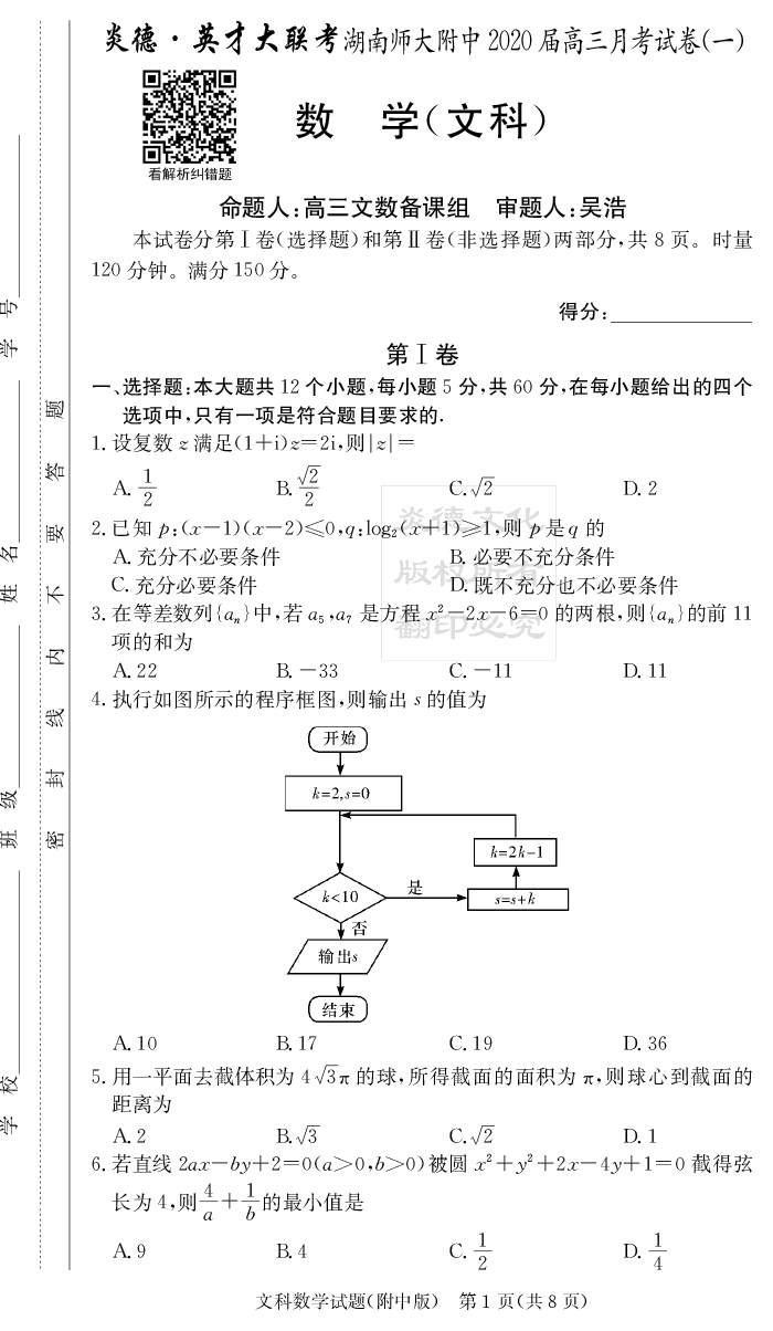 【文數(shù)】炎德英才大聯(lián)考2020屆師大附中高三1次月考