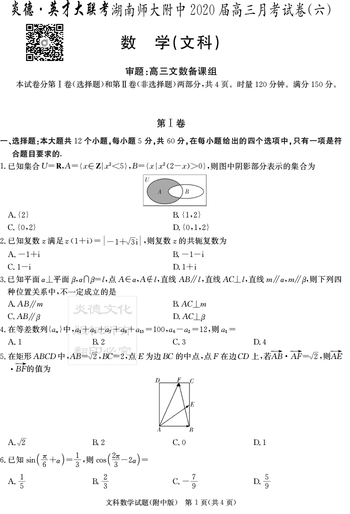 【文數(shù)】炎德英才大聯(lián)考2020屆師大附中高三6次月考