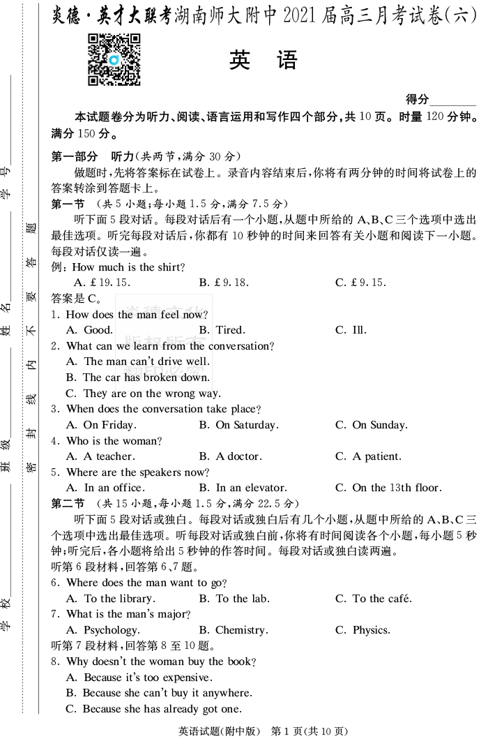 【英語(yǔ)】炎德英才大聯(lián)考2021屆湖南師大附中高三6次月考