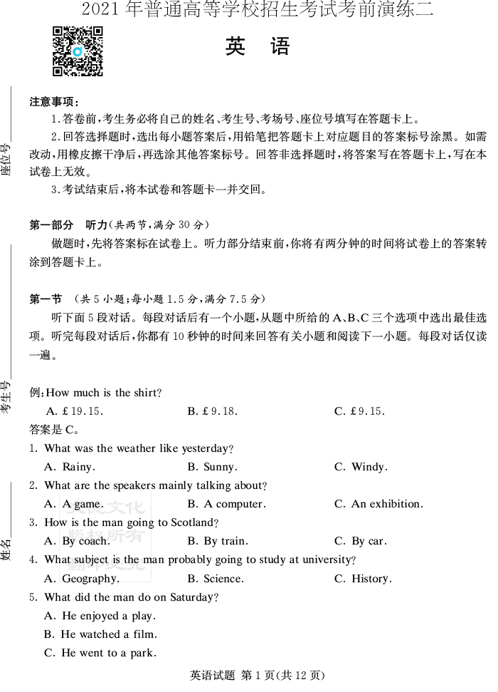 【英語】2021年普通高等學(xué)校招生全國統(tǒng)一考試考前演練(二)