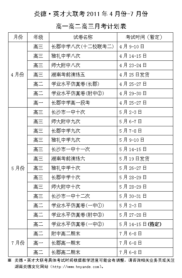 炎德英才大聯(lián)考2011年4-7月份高一高二高三月考計(jì)劃表