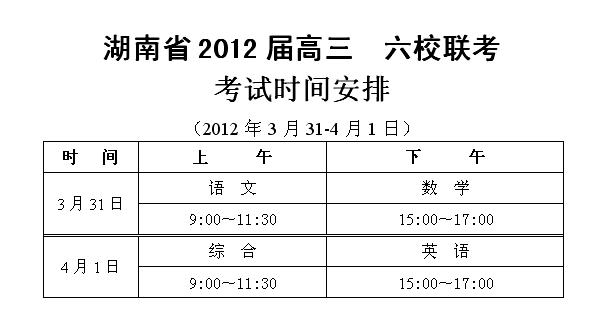 湖南省2012屆高三六校聯(lián)考考試時(shí)間安排