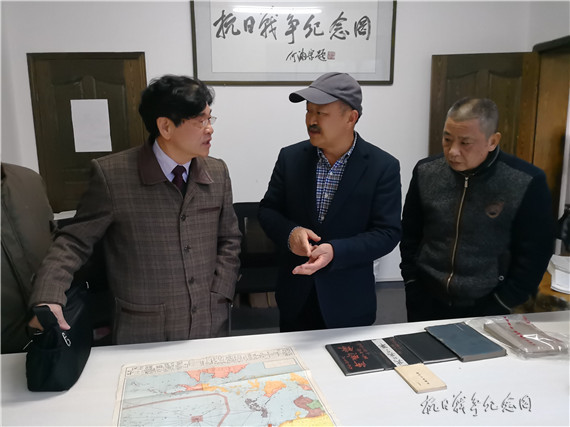 長沙市抗戰(zhàn)文化研究會會長、抗日戰(zhàn)爭紀(jì)念網(wǎng)主編、抗日戰(zhàn)爭圖書館館長何譽軍(左二)向長沙市關(guān)工委主任董學(xué)生(左一)等介紹抗日戰(zhàn)爭圖書館館藏資料
