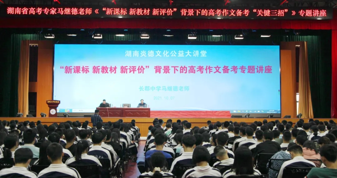 “乘騏驥以馳騁兮,來(lái)吾道夫先路。”金秋十月,大美校園,風(fēng)送桂香,最是高三學(xué)子發(fā)奮時(shí)。2021年10月7日下午,望城二中攜手湖南炎德文化實(shí)業(yè)有限公司,舉辦主題為“新高考背景下高考命題特點(diǎn)及沖刺策略(語(yǔ)文學(xué)科)”的教育服務(wù)公益活動(dòng)。高三年級(jí)全體班主任、語(yǔ)文教師及學(xué)生齊聚俊德樓三樓報(bào)告廳,在特邀專家馬繼德老師的引領(lǐng)下,探尋高考作文備考之路。