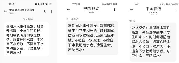 7月13日,教育部、工信部協(xié)調中國電信、中國移動、中國聯通三大運營商,向全國手機用戶發(fā)送了暑期防溺水公益短信。短信內容為:暑期溺水事件高發(fā),教育部提醒中小學生和家長,時刻緊繃防范溺水這根弦,遠離危險水域,不私自下水游泳,不擅自下水救助落水者。珍愛生命,嚴防溺水!不少學生家長收到公益短信后表示,孩子安全大意不得,將會履行好監(jiān)護職責,高度關注孩子暑期安全。