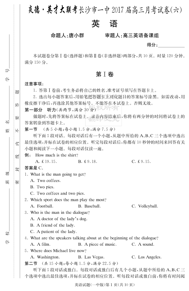 【英語(yǔ)】炎德英才大聯(lián)考2017長(zhǎng)沙一中高三6次月考